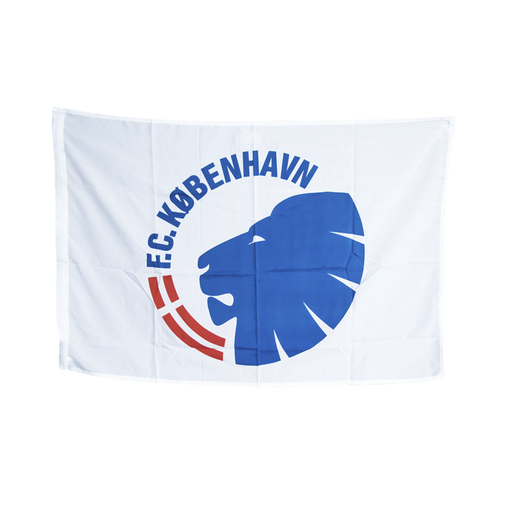 Klassisk hvidt F.C. København flag med klubbens logo centreret på begge sider, perfekt til at vise klubbens logo og farver frem i Parken, og diverse udebaner, hvor FCK spiller. Flaget sendes uden pind, men kan hentes i butikken mod fremvisning af kvitteringen.