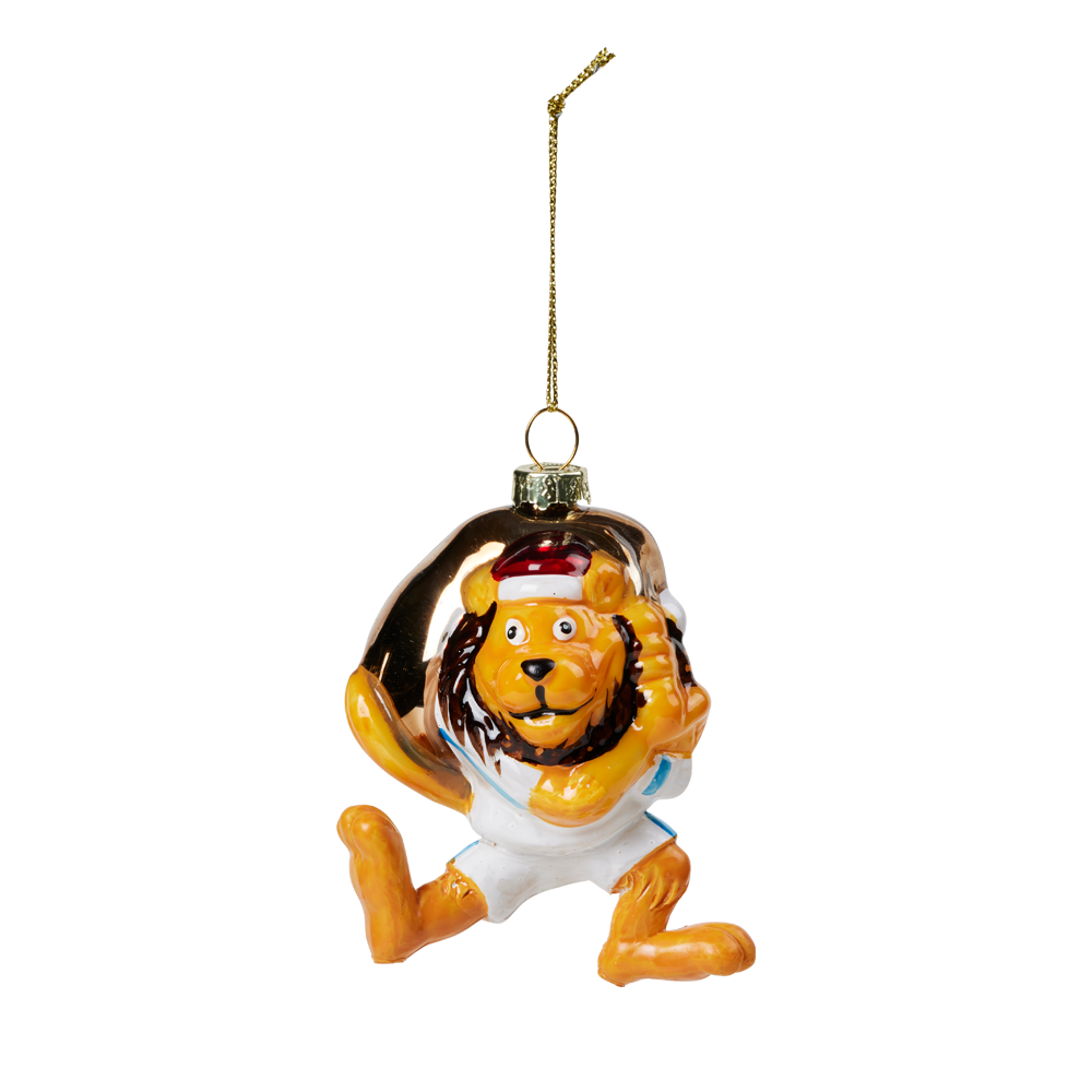 Glass Christmas tree bauble with Leo motif.